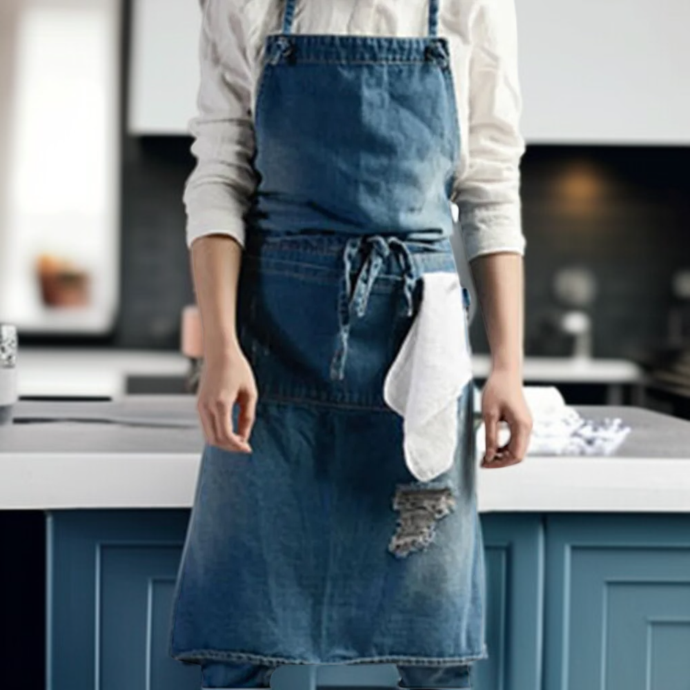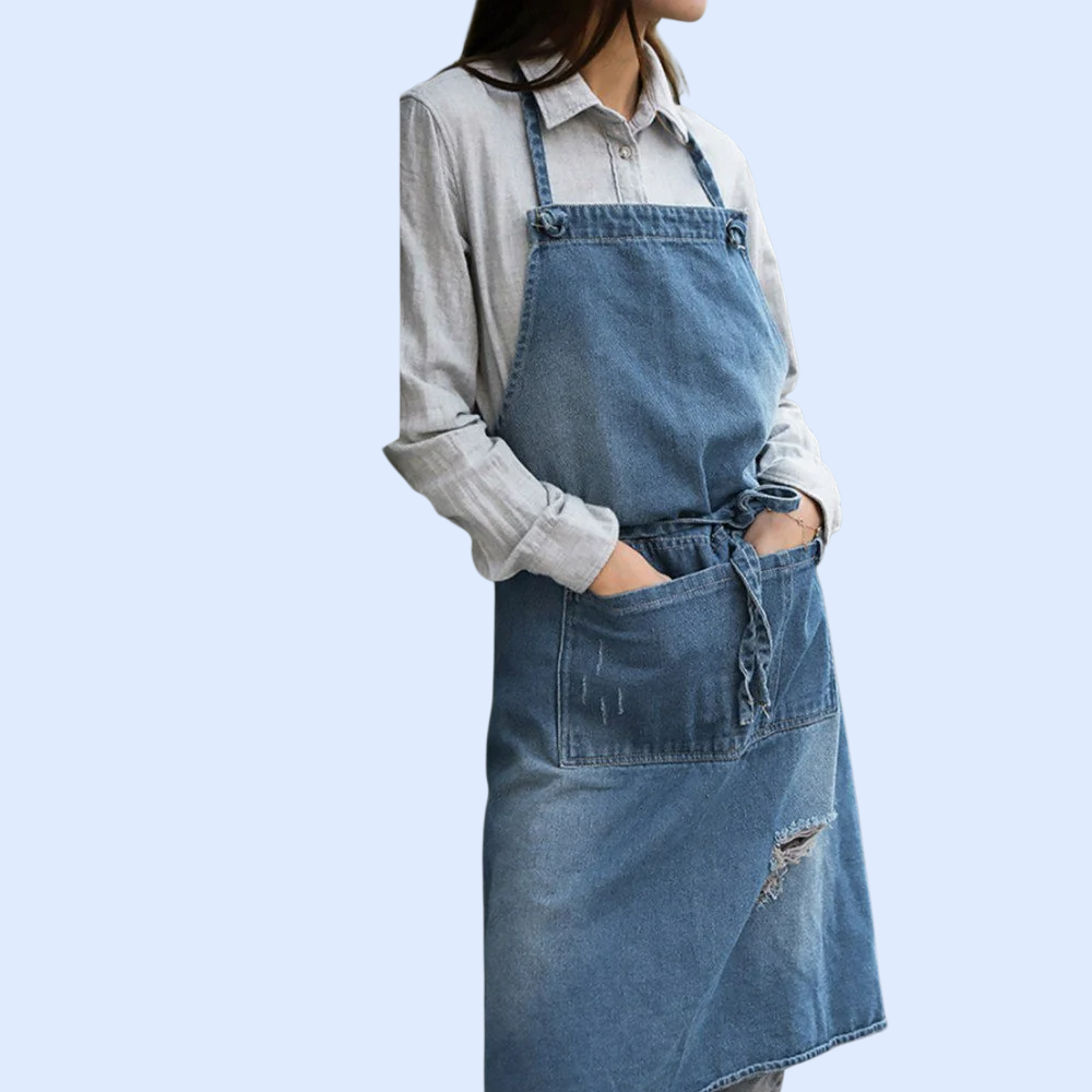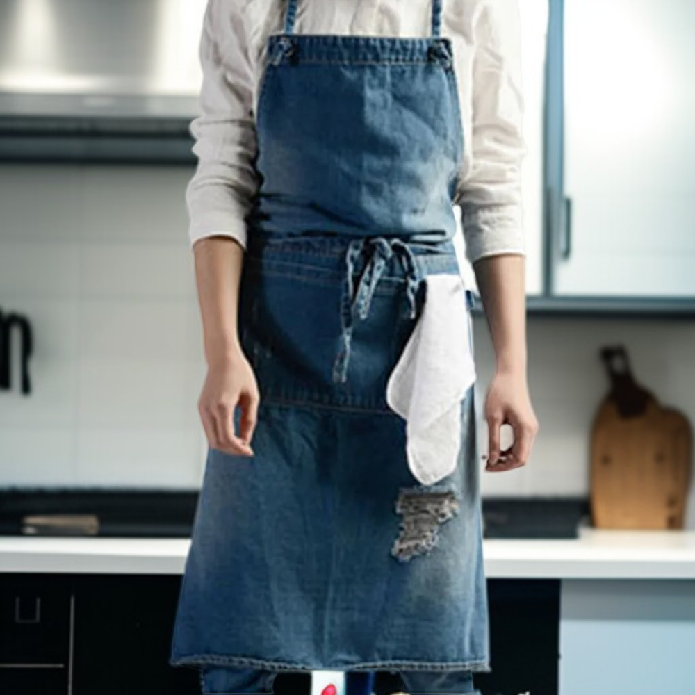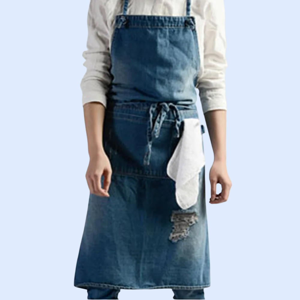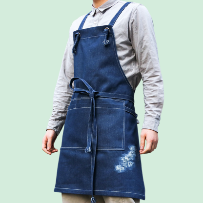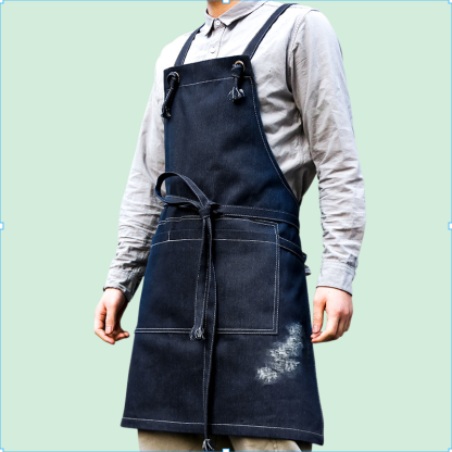 耐磨牛仔圍裙,適合男女士工作穿著,防油防污,易清潔,多口袋設計,收納方便,適用餐飲、美髮、烘焙等多種場景。